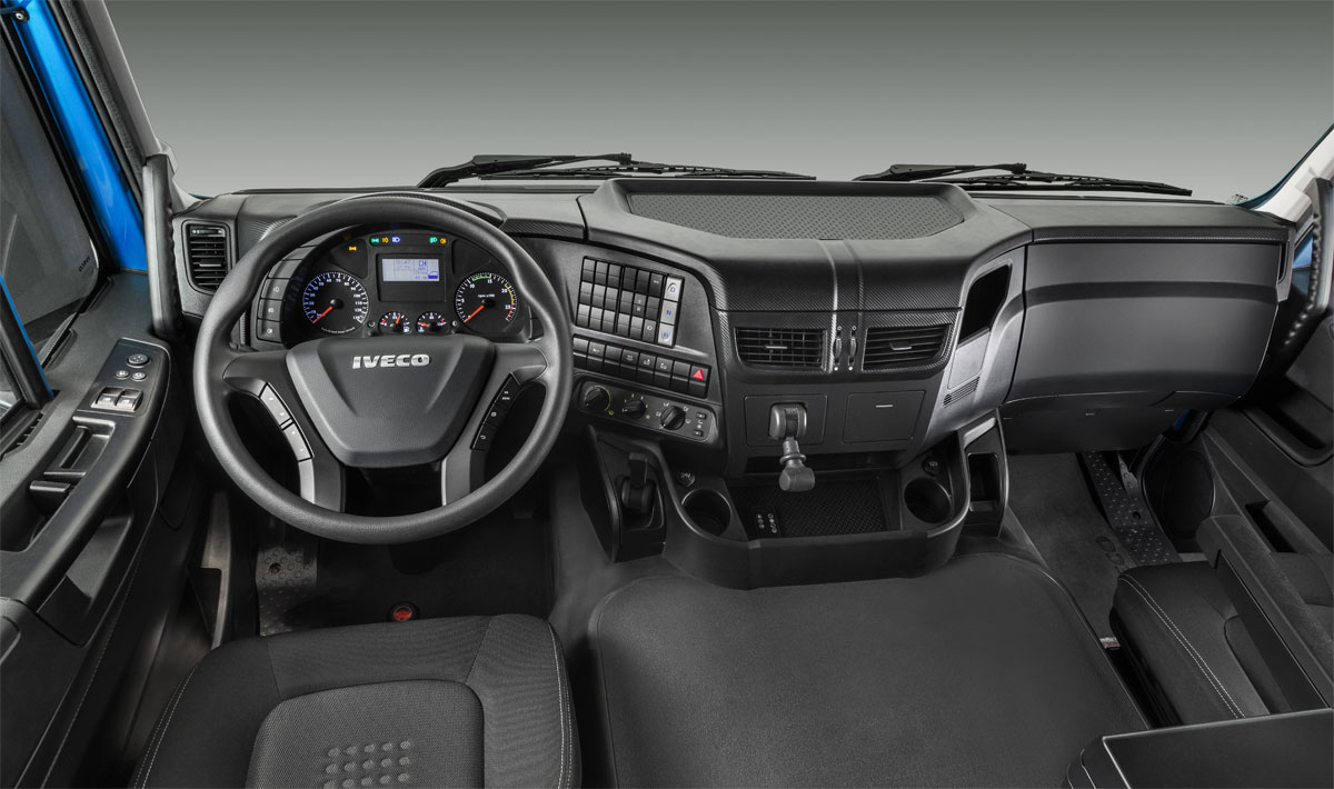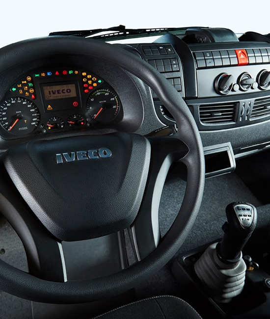 Tablero al alcance de la mano con todo lo necesario para una conducción cómoda y segura. Columna de dirección regulable en todas las posiciones, asiento ergonómico con suspensión neumática para un mayor confort.
